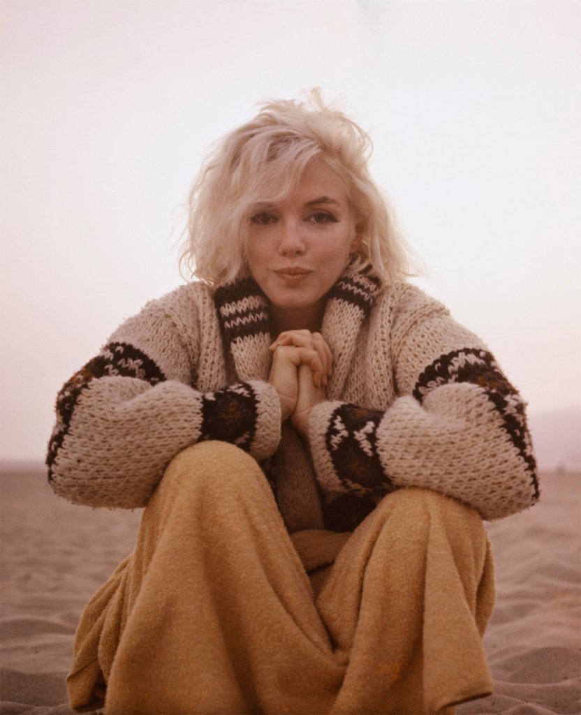 Marilyn wore this chunky cream wool cardigan, which was decorated with a brown and navy geometric pattern across the centre, cuffs and neck, on a couple of occasions in 1962. It even had a matching knitted belt. It was famously featured in a series of photos by photographer and confidant George Barris, which were taken on the beach in Santa Monica, California. Here’s a great write-up by The Girl Loves Vintage, who managed to research it and recreate a very similar look.
