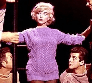 In ‘Let’s Make Love’, 1960, Marilyn was filmed wearing nothing but an oversized aran cable-knit jumper and tights. This purple sweater dress feels ahead of its time. Aran knits take a helluva long time to knit, but thankfully you can purchase a replica from The TWOSisterStore on Etsy for £165.